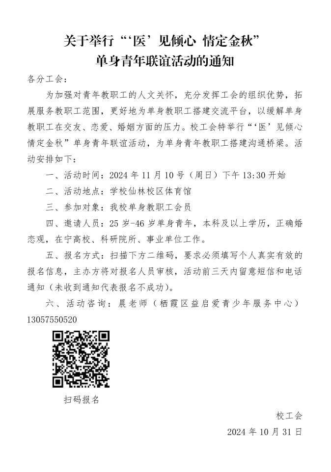 关于举行“‘医’见倾心 情定金秋” 单身青年联谊活动的通知